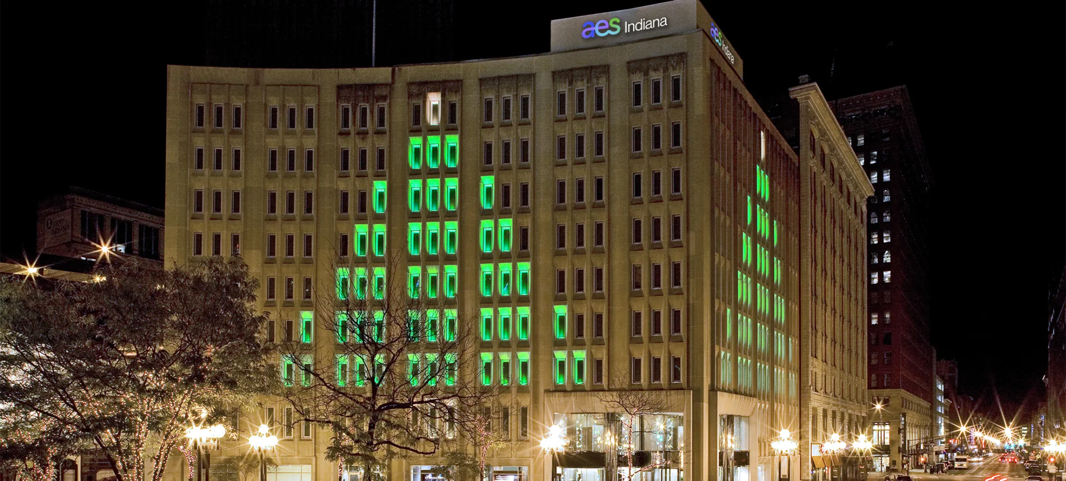 AES Indiana window lights began in 1954 with red and green stripes for Christmas. Maintenance crews had to change each bulb by hand to get the different colors. Today, AES Indiana’s 10-story building has 267 individually controlled windows, each equipped with 36 high-efficiency bulbs that can generate 16 million different color combinations.